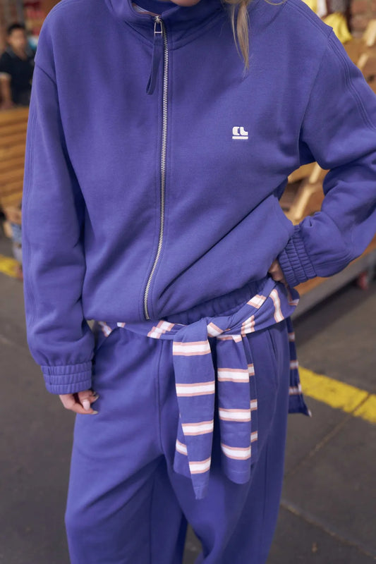 Isla Slouchy Crew in Brunette Brown Buff Sky Blue Heritage Logo by Ceres Life