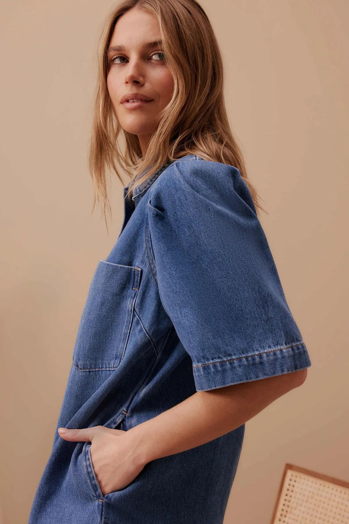 Introducing our Dylan Pleat Sleeve Denim Shirt dress. Crafted from 10.8 oz rigid mid-weight denim, this shirt features 100% organic cotton. Complete with an upper patch pockets, pockets in the side seams, denim-covered buttons, and pleats at the shoulder. This dress is the perfect blend relaxed and effortless style.