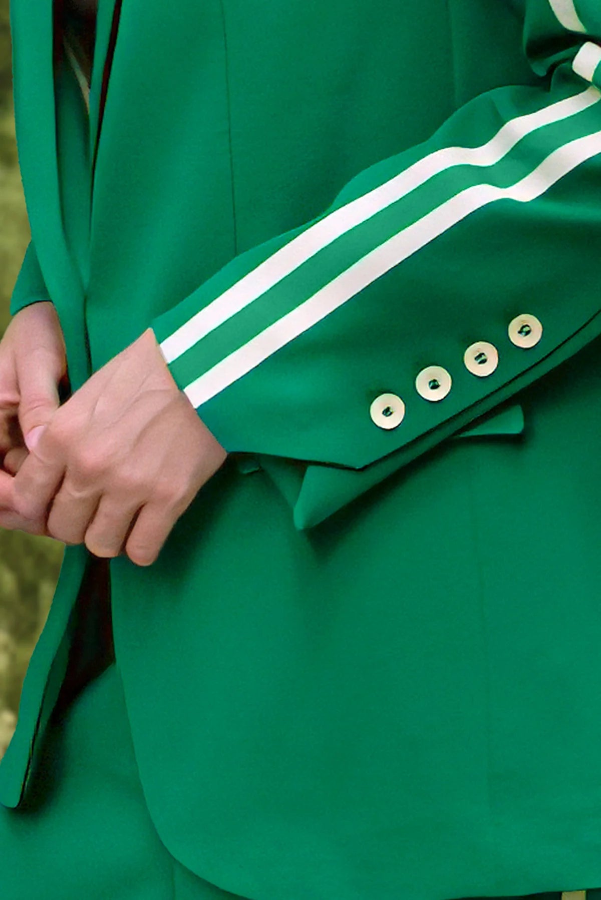 Relaxed shaping and a soft tailored fit, we’re bringing back a wardrobe staple, the ‘Blazer’s Edge’ blazer. Edgy, classic and modern, crafted in the ‘Suit Yourself’ crepe suiting, our signature Cooper blazer is designed for versatility and easy styling. Fastening at the front with a single cream button, and trimmed with sport stripe tape, wear with the matching ‘Step in Time’ trouser for every day suiting, or pair back with denim and jeans for a casual, sporty look.