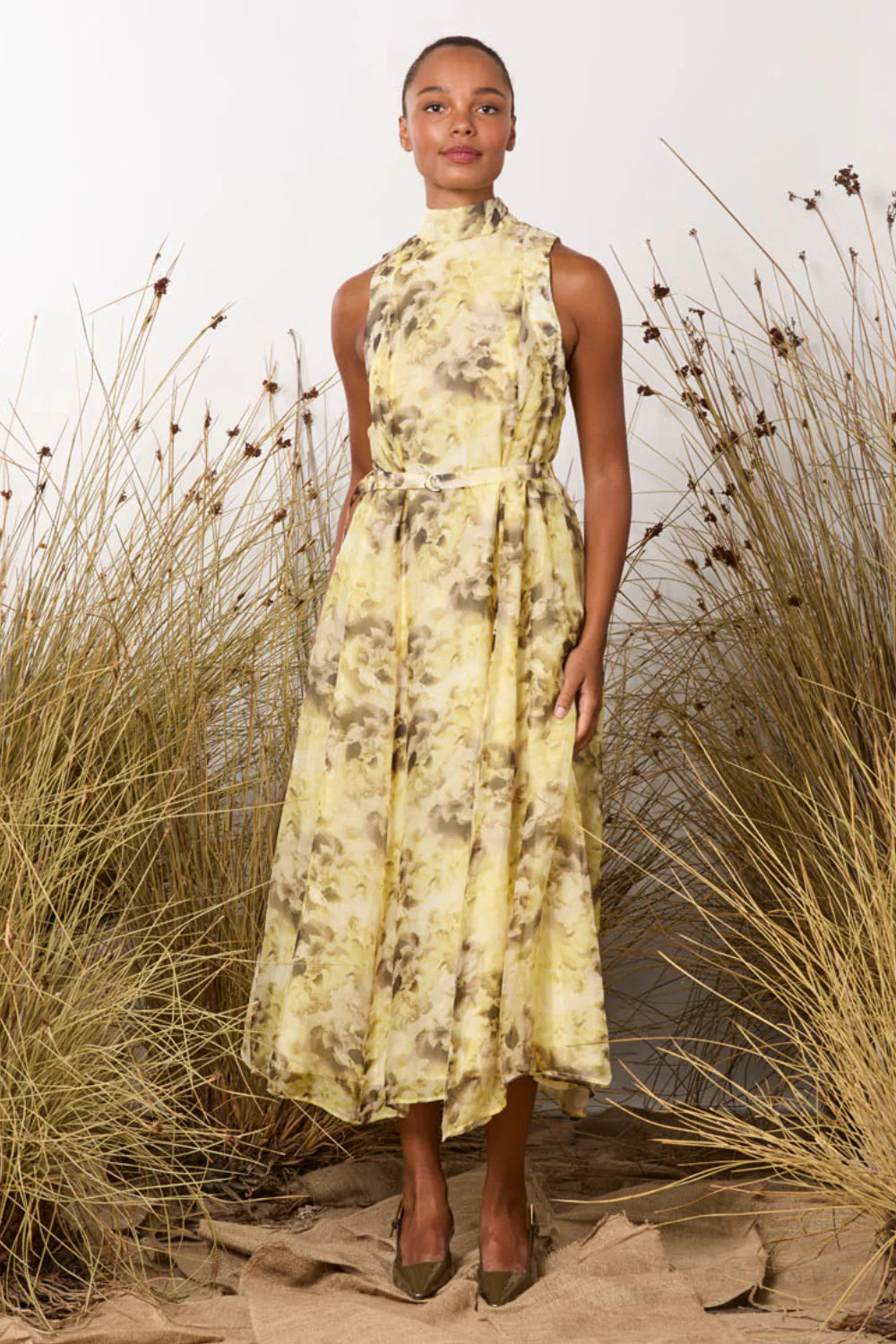 he Rani Dress exudes feminine elegance with its soft, ethereal floral print and flattering silhouette. This sleeveless midi dress features a high neckline and a delicate tie belt at the waist for a tailored, yet relaxed fit. The soft yellow and muted floral tones add a refreshing touch, making it a perfect choice for warm weather occasions. Whether worn for a garden party or a day out with friends, this dress combines grace and modern sophistication effortlessly.