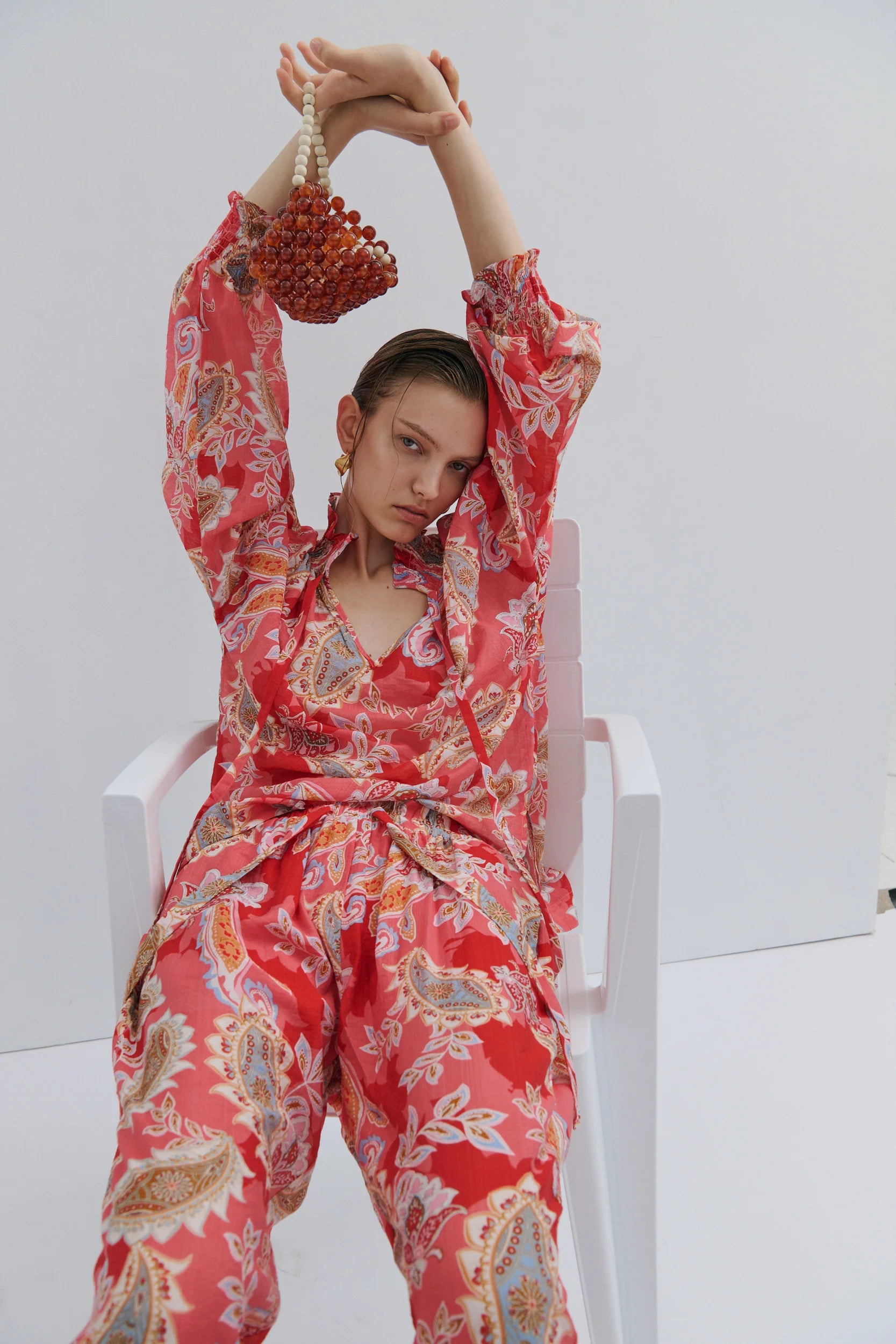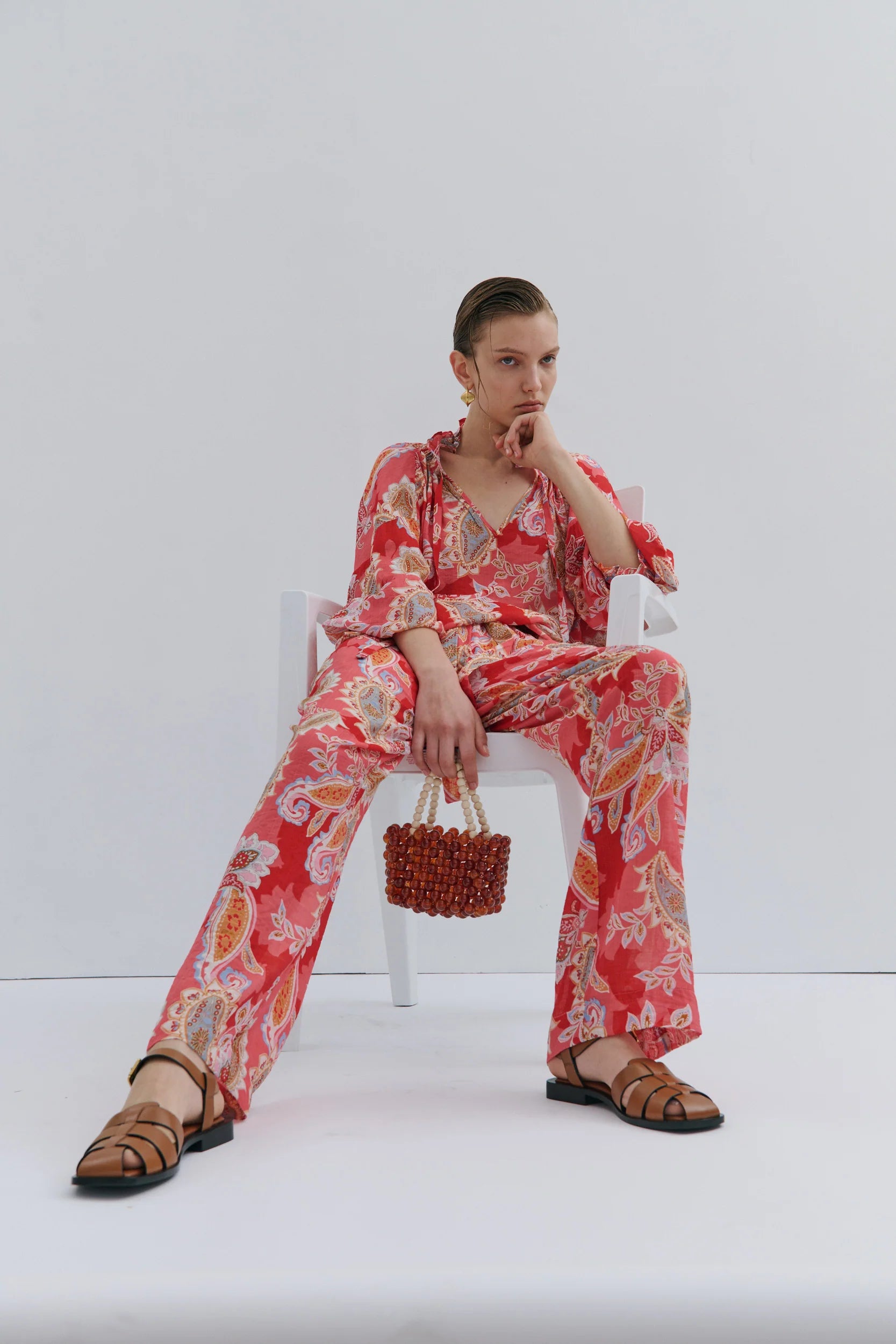 Channel Anita Pallenberg with the option of a long V-neck opening, letting the light top flow effortlessly with matching pants, bringing a boho chic yet refined essence.